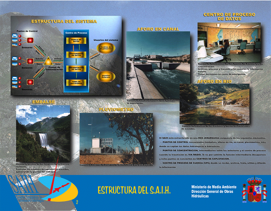 El Sistema Automático de Gestión Hidrológica (S.A.I.H.) empezó a desarrollarse en el año 1983 como una de las actividades del PROGRAMA GENERAL DE SEGURIDAD DE LAS PRESAS DEL ESTADO y con el objetivo inicial de disminuir los efectos catastróficos de las avenidas. El S.A.I.H. se estructura como una red de captación de datos hidrológico-hidráulicos transmitidos en tiempo real a los Centros de Decisión cuya aplicación se orienta a la mejora de la gestión de los recursos hídricos en cualquier escenario climatológico.